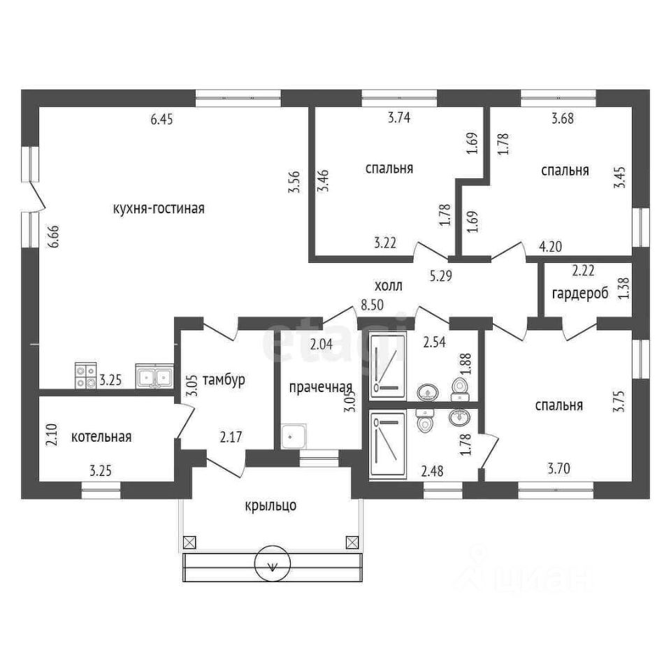 Планировка продумана для комфортного проживания: две комнаты по 13 м², мастер-спальня 12,5 м² с собственной гардеробной (3,2 м²) и санузлом (4,5 м²). Дополнительно предусмотрен второй санузел (4,5 м²) и постирочная (5,7 м²). Просторная кухня-гостиная площадью 37,4 м² позволяет проводить уютные вечера в семейном кругу.