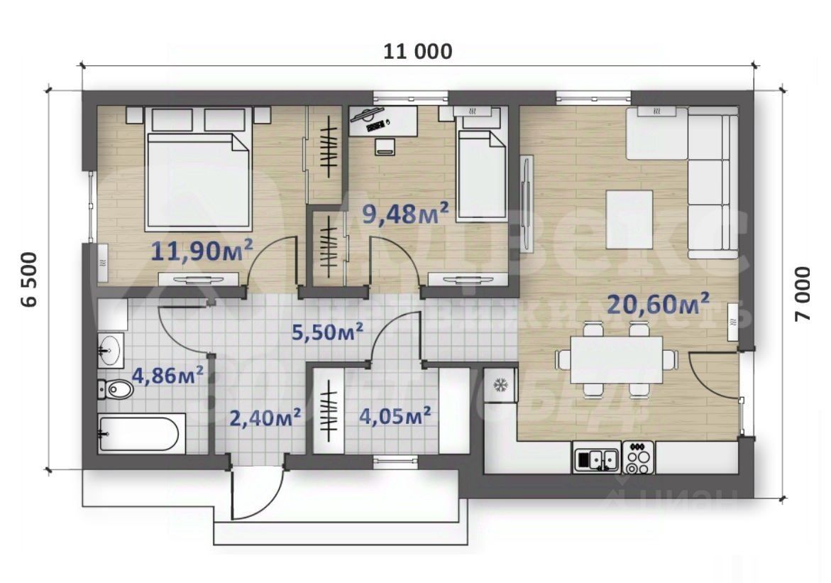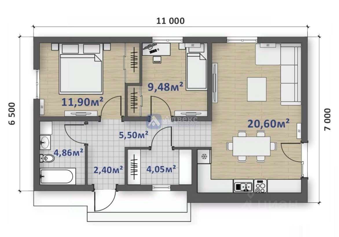 • Кухня-гостиная с выходом на террасу. В спальных коматах удобные ниши для шкафов. Так же есть отдельная гардеробная.