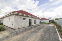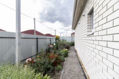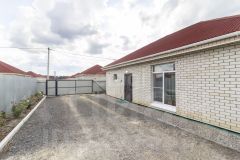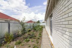 Фундамент: ленточный с залитой монолитной плитой, обеспечивающий прочность и долговечность.Наружные стены: блок поревит, облицованный кирпичом, что гарантирует теплоизоляцию и эстетичный внешний вид.Крыша: четырёхскатная, оборудована водосточными сливами для защиты от осадков.Окна: тройной стеклопакет для максимальной тепло- и звукоизоляции.Входная дверь: металлическая, надёжная и безопасная.Внутри: натяжной потолок, стены украшены жидкими обоями, пол — керамическая плитка.Межкомнатные двери: установлены современные двери.