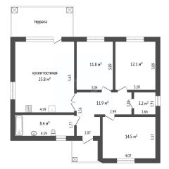 В доме - 3 спальни, большая кухня-гостиная 32,3 м2 и открытая терраса.