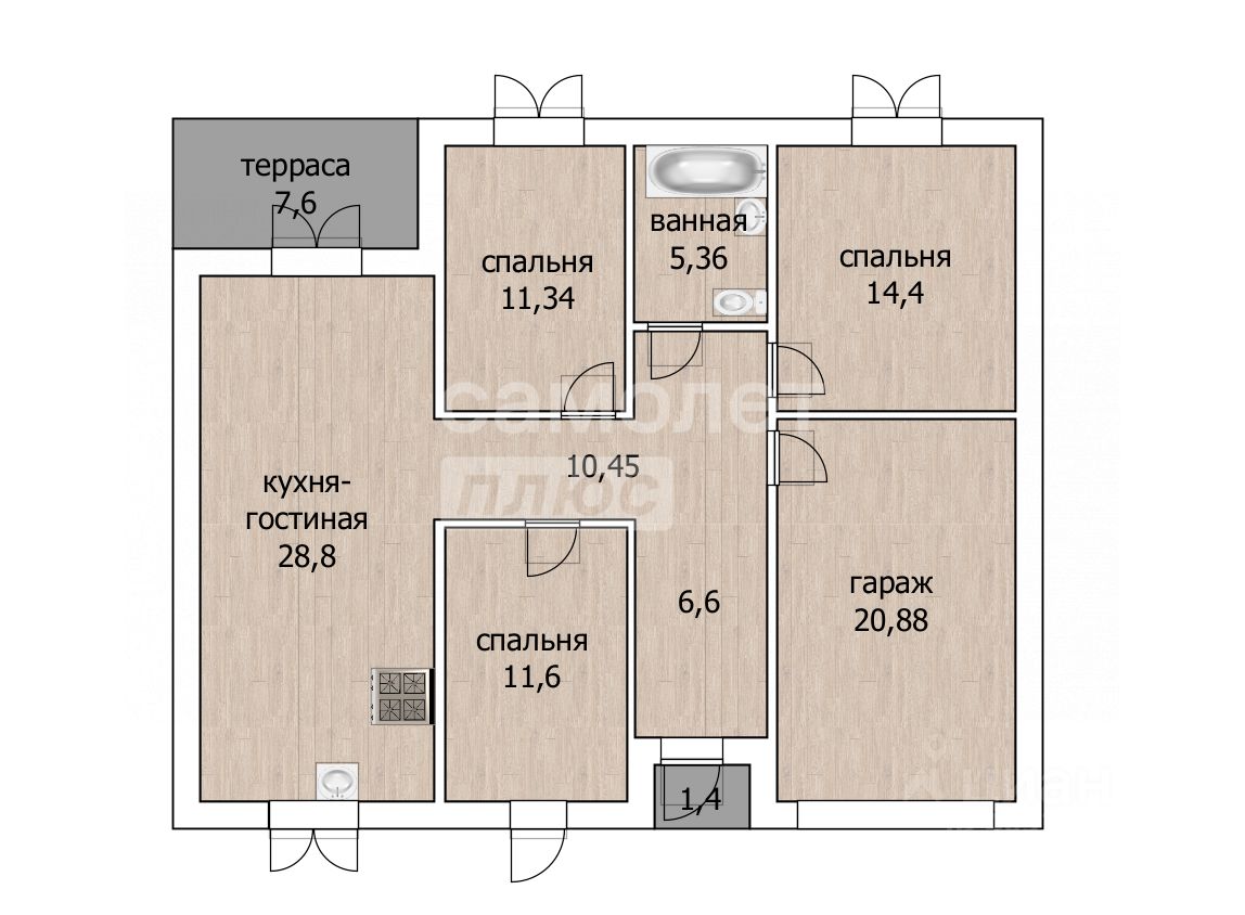 3 большие спальни (14.4 м², 11.34 м², 11.6 м²) хватит места всей семье!