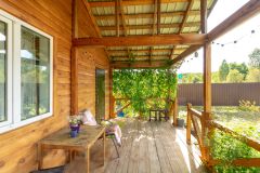 Большая терраса дома с девичьим виноградом создаст тень и атмосферу уюта .