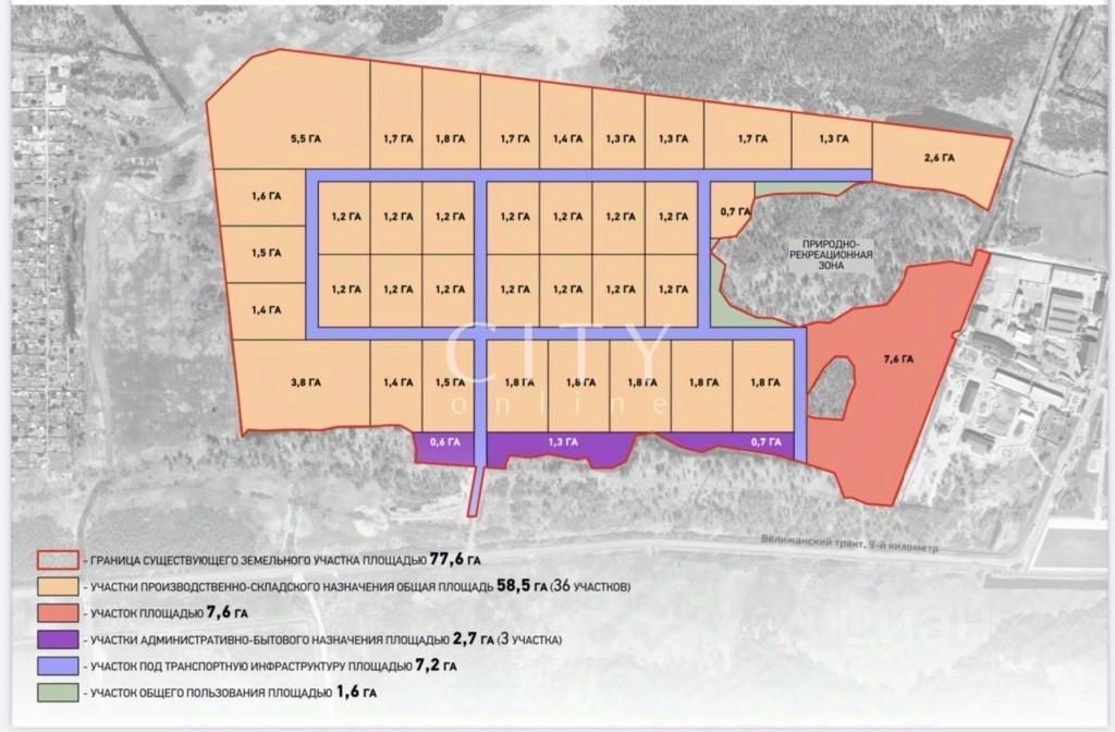 Арт. 77174311. Производственно-складской комплекс общей площадью земельного участка 77,6 га с формированием участков складского и промышленного назначения площадью от1,2га (36 участков) административно-бытового назначения 3 участка. Общая протяженность проездов общего пользования 3 493 кв.м., ширина проездов, площадь асфальтобетонного покрытия проездов 28 625 кв.м. Возможность подключения сетей III квартал 2025г.Стоимость 1 от 20 млн/га. все вопросы по телефону.