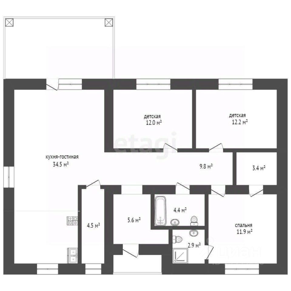 Внутри дома вас ждет просторная кухня-гостиная площадью 35,6 кв.м., где благодаря витражным окнам проникает много света. Из этой зоны вы сможете выйти на террасу размером 15 кв.м., которую можно остеклить