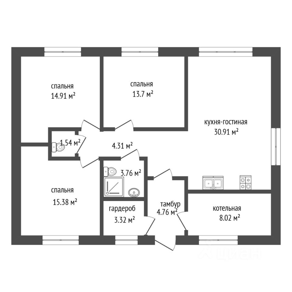 Три изолированные спальных комнаты правильной формы обеспечивают удобство и комфорт для всей семьи, а также отдельные помещения выделены под гардероб и котельную.