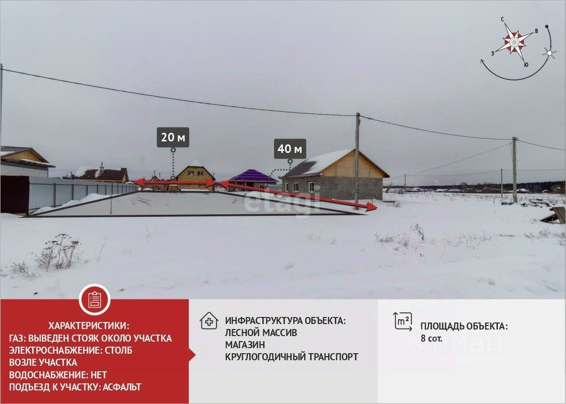 Площадь участка составляет 8 соток, имеет правильную прямоугольную форму, хорошо подойдет для постройки дома. Участок расположен в "малом поле". Отличное месторасположение - эта нарезка окружена лесным массивом с 3 сторон, рядом красивое озеро; в 4 км г. Тюмень, а в ближайшее время будет прямой выезд на ул Калинина через район Тюменская слобода и на Червишевский тракт.