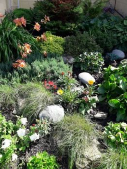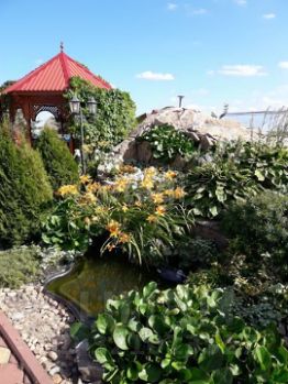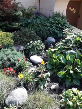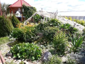 На участке много хвойных-голубые ели очень высокие-4 шт., сосны низкорослые, туи и множество других насаждений. Красивейшие пионы.