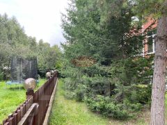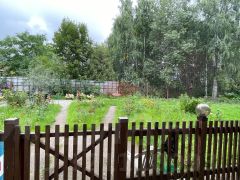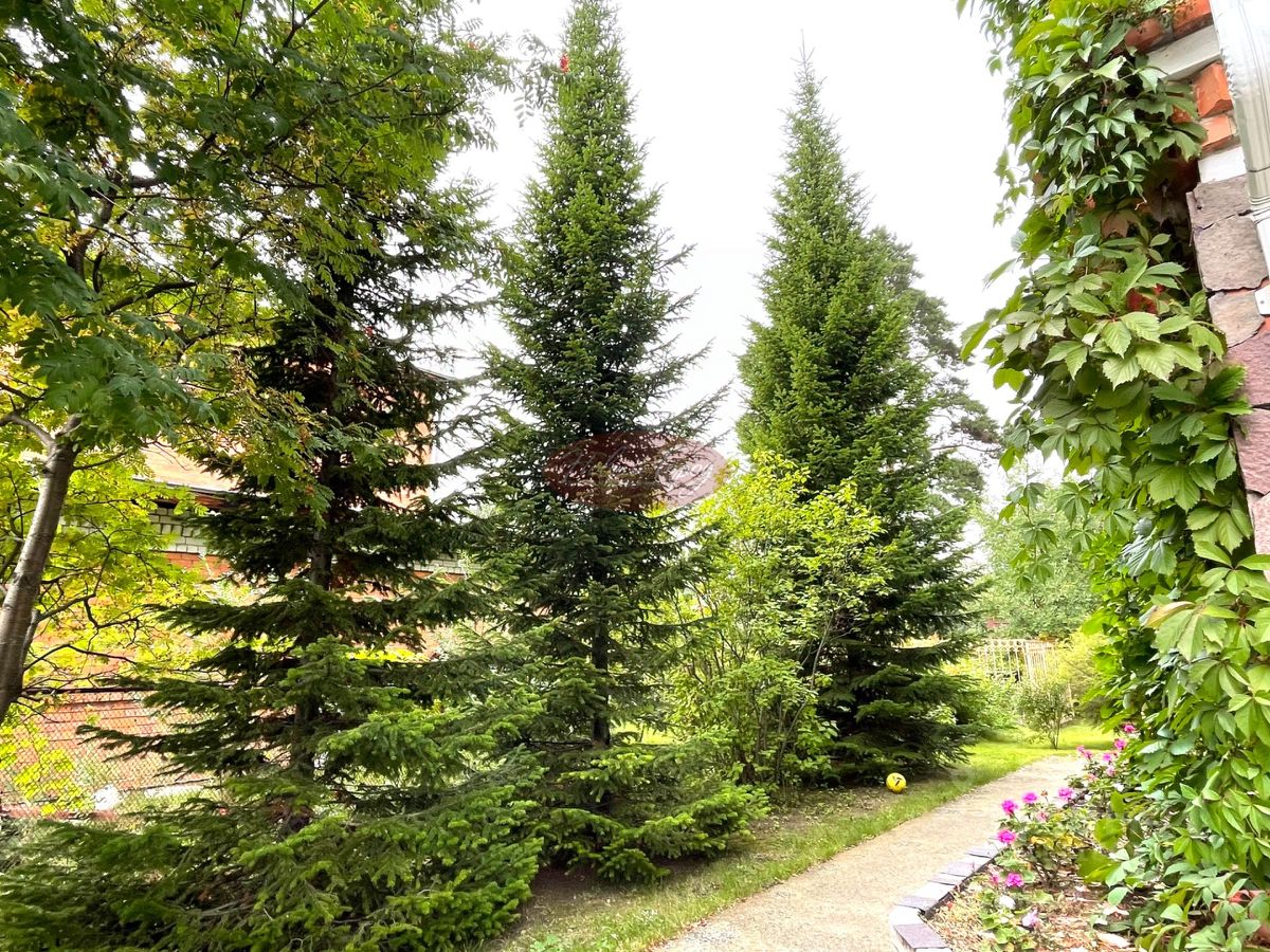 На участке крупные ели, сосны, лиственниц , дуб и ягодные деревья и кустарники,