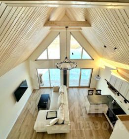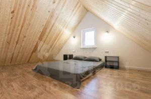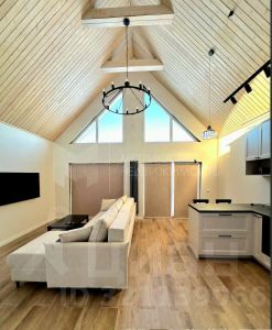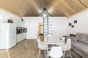 Потолки отделаны вагонкой в в кухне-гостиной и мансарде, в остальных комнатах -натяжные потолки с точечными светильниками.