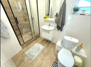 Санузел - душевое ограждение или ванна, тумба с раковиной, напольный унитаз, проложены коммуникации для стиральной машины.
