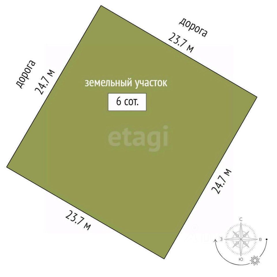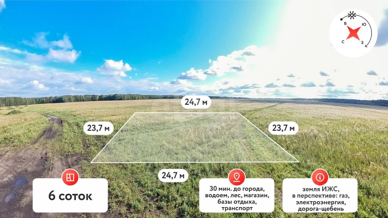 Продаётся земельный участок правильной формы 6 соток. Назначение земли ИЖС (Ж1) (Индивидуальное Жилищное Строительство). Строить можно ВСЁ!!! Межевание выполнено, поэтому вы можете быть уверены в точности границ участка. Никаких ограничений и охранных зон нет. Дорога асфальт и немного грунт на сегодня. В скором времени сделают дороги в щебне.