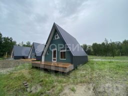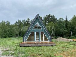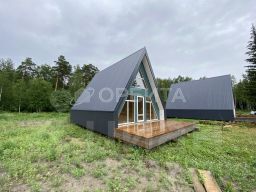 В доме на первом этаже большая кухня-гостиная с потолком более 4,5 метров и с большими панорамными окнами, здесь же расположена спальня и санузел. На втором этаже обустроена ещё одна спальня. С двух сторон дома большие открытые террасы.