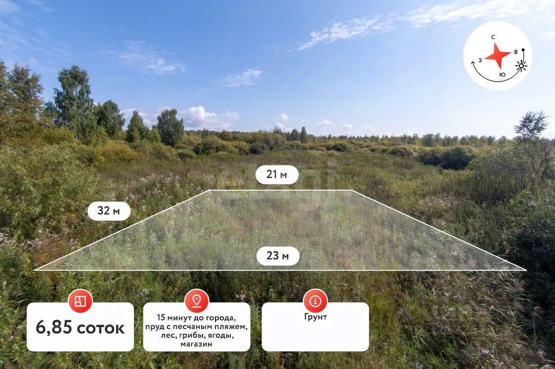Окрестности сочетают практичные преимущества с рекреационными возможностями. В 800 метрах от участка находится пруд с песчаным пляжем, подходящий для купания и летнего отдыха. Близлежащие леса богаты грибами и ягодами, а наличие магазина в шаговой доступности упрощает бытовые вопросы. Качественные подъездные пути позволяют добраться до участка без сезонных сложностей, а плодородная почва дает возможность разбить огород или сад.