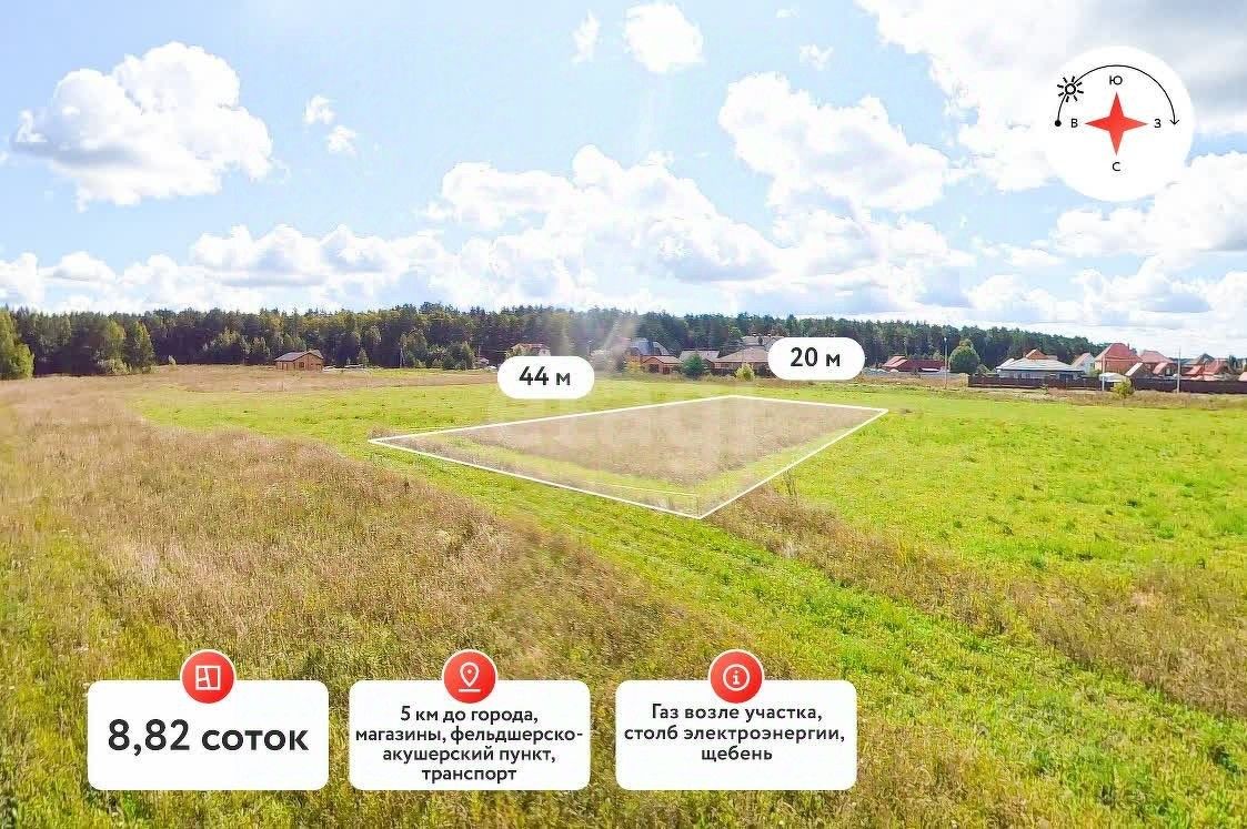 Площадь: 8,8 соток (идеальный размер для строительства частного дома и обустройства сада) .