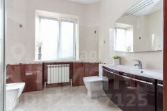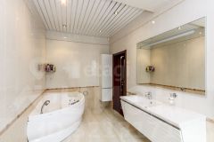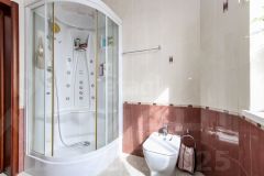 На первом этаже располагается гостевая зона 37.6 кв.м. с камином, кухня-столовая 19.4 кв.м., шикарный санузел 11.4 кв.м. с джакузи, теплый гараж с автоматическими воротами; Банный комплекс с бассейном 3х5 метров, сауной, душевой комнатой и комнатой отдыха!