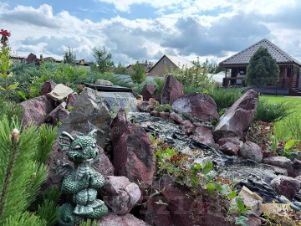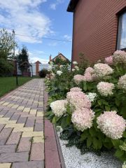 Участок благоустроен: здесь высажены плодовые и декоративные деревья, организован автополив и полноценное освещение по периметру.