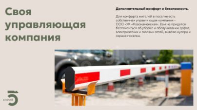 В поселке есть все необходимые коммуникации: газ, электричество, интернет, дороги с твердым покрытием, уличное освещение, указатели с названием улиц, шлагбаум с охраной и круглосуточным видеонаблюдением.