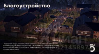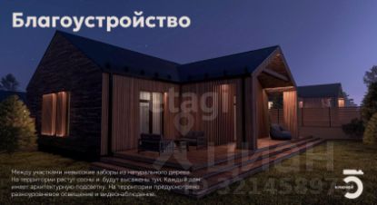 Благоустроенная территория: главная дорога, парковка, площадка из брусчатки перед домом, лужайка с зеленым газоном и живыми изгородями. Невысокие заборы из натурального дерева между участками, архитектурная подсветка домов и разноуровневое освещение территории.