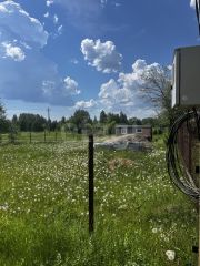 На территории находится вагончик, который можно использовать как временное жилье, мастерскую или хранилище для инструментов. В нем уже установлена печь, что позволяет обустроить баню или отопить помещение в холодное время года. По периметру участка частично возведен забор — с двух сторон он полностью готов, а на остальных установлены столбы, что дает возможность быстро завершить ограждение. Также имеется выгребная яма под туалет, что упрощает организацию быта на этапе строительства.