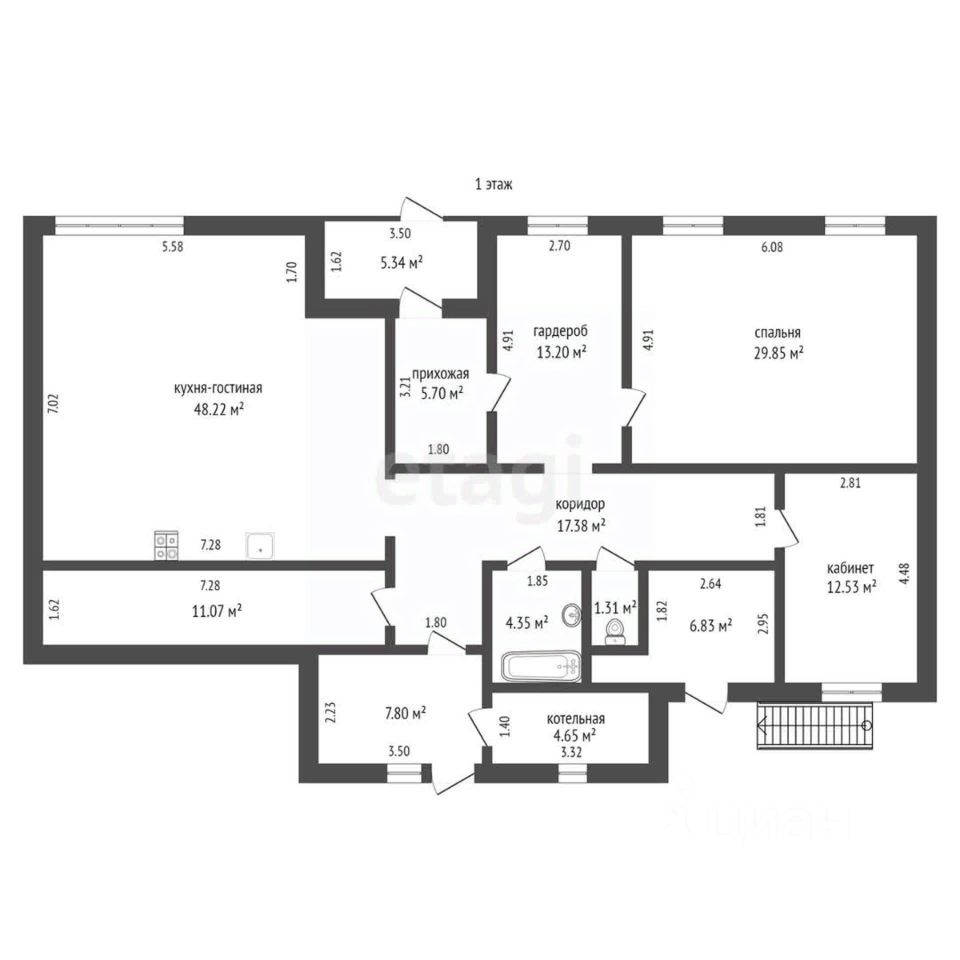- 1 этаж: просторная прихожая, кухня-столовая 48кв.м, раздельные туалет и