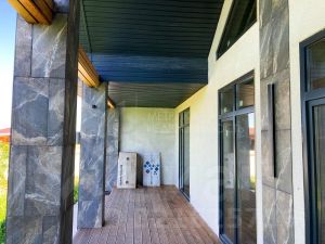 Столбы передние мраморная крошка, терраса - лиственница, отделка ступеней - керамогранит (цвет серый), отделка отмостки - утеплитель камень;