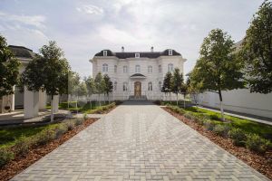 Перед участком насаждения из ели, пихты и жасмина, что создает микроклимат защищающий от пыли, грязи и шума.