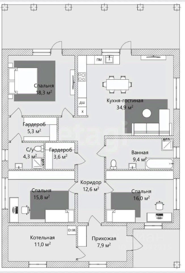 180 м² продуманного комфорта: кухня-гостиная для теплых вечеров, гардеробная для удобства, котельная с местом под прачечную.