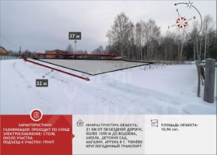 Земельный участок площадью 10,96 соток расположен в экологически чистом районе, в окружении смешанного леса. Участок правильной формы, с ровным рельефом, что упрощает строительство. Подведены коммуникации: электричество, газ по границе, есть возможность подключения центрального водоснабжения или бурения скважины. Земля предназначена для индивидуального жилищного строительства, категория — земли населенных пунктов, все документы оформлены.