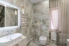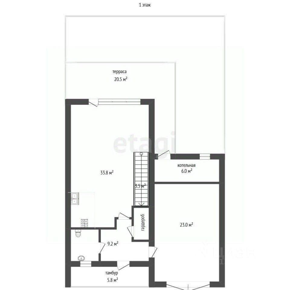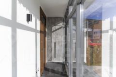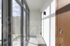 Входная группа утеплена: установлен тройной стеклопакет+теплый электро пол. Здесь можно оставить верхнюю одежду и уличную обувь. Входная дверь с термо-разрывом. Гостевой сан.узел оборудован лапомойкой. На полу керамогранит, на стенах декоративная штукатурка. Оборудован. гардероб. Кухня гостиная 34 кв.метров с витражным остеклением и выходом на террасу. Под зоной ТВ находится встроенный камин на био-топливе. В зоне кухни на полу керамогранит, в зоне отдыха - паркетная доска. Межэтажная лестница из дуба, есть подсветка.