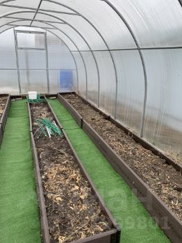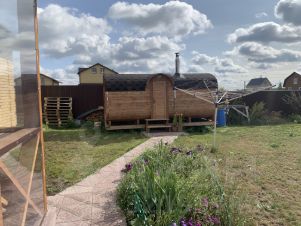 На участке установлена баня-бочка, изготовленная из кедра, теплица с теплыми грядками из ДПК, посажены плодовые деревья: яблоня, груша, вишня, алыча.