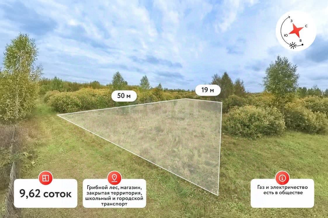 Участок 9,62 соток , выполнено межевание , рядом ухоженные соседские участки , дороги: межквартальные проезды песок +щебень, центральная - срезка. Очень живописное место, рядом грибной лес.