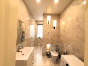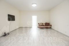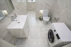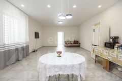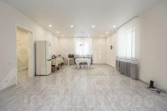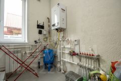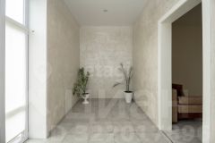 В санузле, котельной, на кухне в зоне готовки и в прихожей-входная зона на полу керамогранит, в комнатах и в прихожей на полу ламинат. Стены- декоративная штукатурка, потолки натяжные.