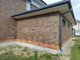 Дом,гараж и терраса на едином фундаменте, монолитная плита 400мм. Несущие стены из керамзитоблока 300мм, утеплитель мин плита Rocwool 100мм, фасад дома комбинированный, керамический кирпич (Баварская кладка) + декоративная штукатурка. Межэтажные перекрытия заводские ЖБИ плиты. Перемычки дверных и оконных проемов из железобетона. Залит армопояс первого и второго этажа. Кровля двухслойная мягкая черепица, утеплитель 200мм. Окна ламинированные Gealan профиль 75мм, двухкамерный стеклопакет.