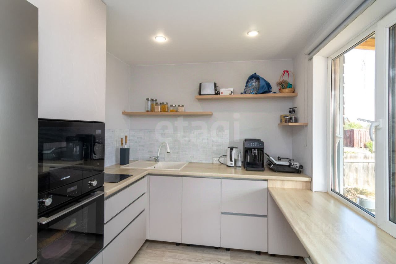 Дом возведен из бруса на надежном ленточном фундаменте с монолитной подушкой и обшит сайдингом, что гарантирует долговечность и минимальные затраты на обслуживание. Внутреннее пространство оформлено современным ремонтом. Высокие потолки и продуманная планировка создают ощущение простора. На первом этаже расположена большая объединенная кухня-гостиная с выходом на уютную террасу — идеальное решение для комфортного отдыха и приема гостей, а так же большая спальня. Второй этаж занимают три комнаты, две из которых изолированные.