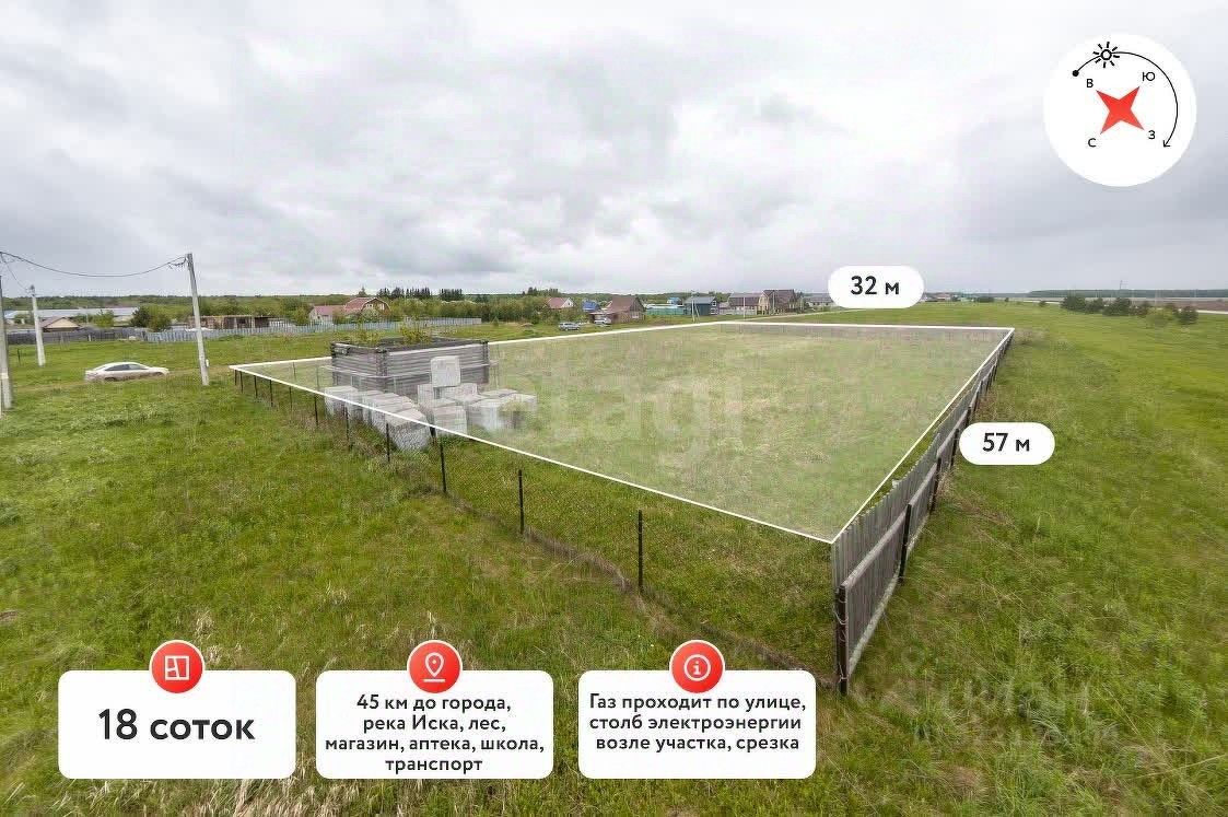Земельный участок площадью 18 соток расположен в селе Иска, в 45 км от Тюмени по Велижанскому тракту. Участок находится в живописной местности на берегу реки Иска, окружен вековыми соснами и смешанным лесом, что обеспечивает уединенность и близость к природе. Река известна среди рыболовов — здесь водятся щука, окунь, карась, елец и чебак, что делает место привлекательным для любителей активного отдыха.