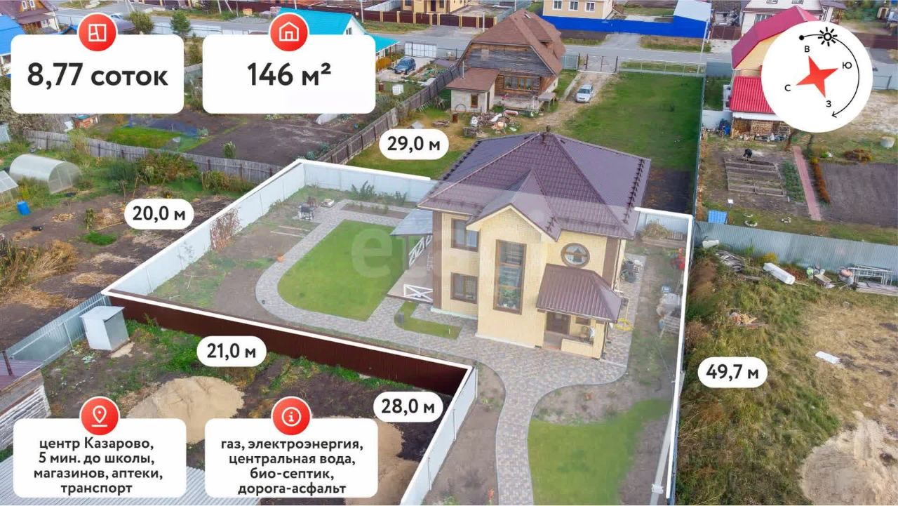 Дом находится в новой центральной части Казарово. Всего 5 минут пешком до новой школы, магазинов, аптек и остановок.