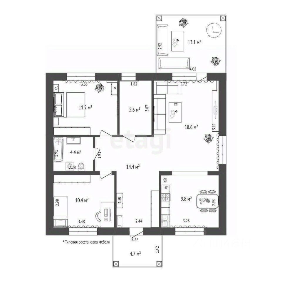 ПЛАНИРОВКА: 3+, 3 спальни, кухня-гостинная, санузел, котельная, гардеробная.