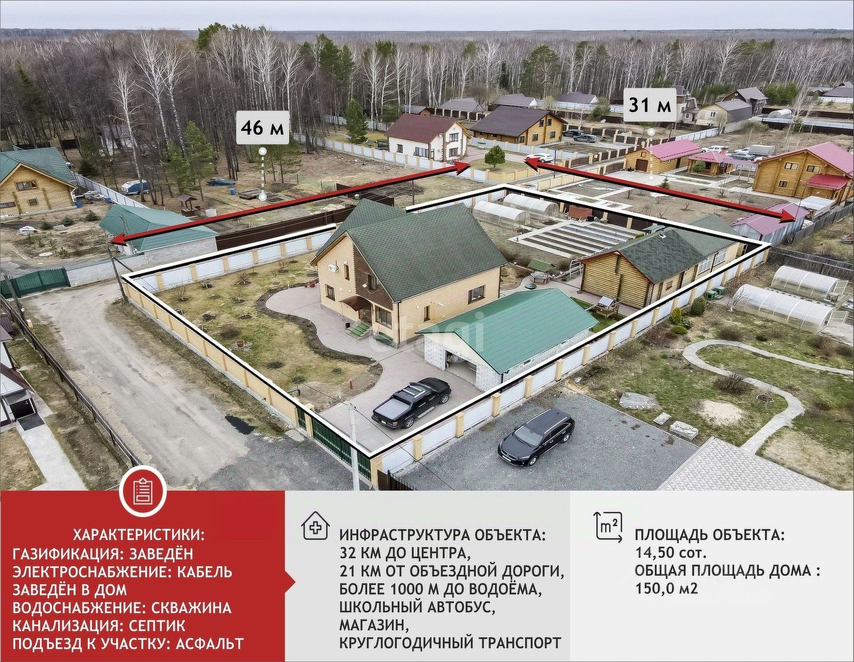 Участок площадью 14,5 соток впечатляет своим ландшафтным дизайном и продуманной зоной отдыха. За домом расположены плодовые насаждения и теплицы, а также уютный домик для отдыха с баней и гараж кирпичный, с автоматическими воротами. Для детей предусмотрена игровая площадка, что делает этот дом идеальным местом для семейной жизни.