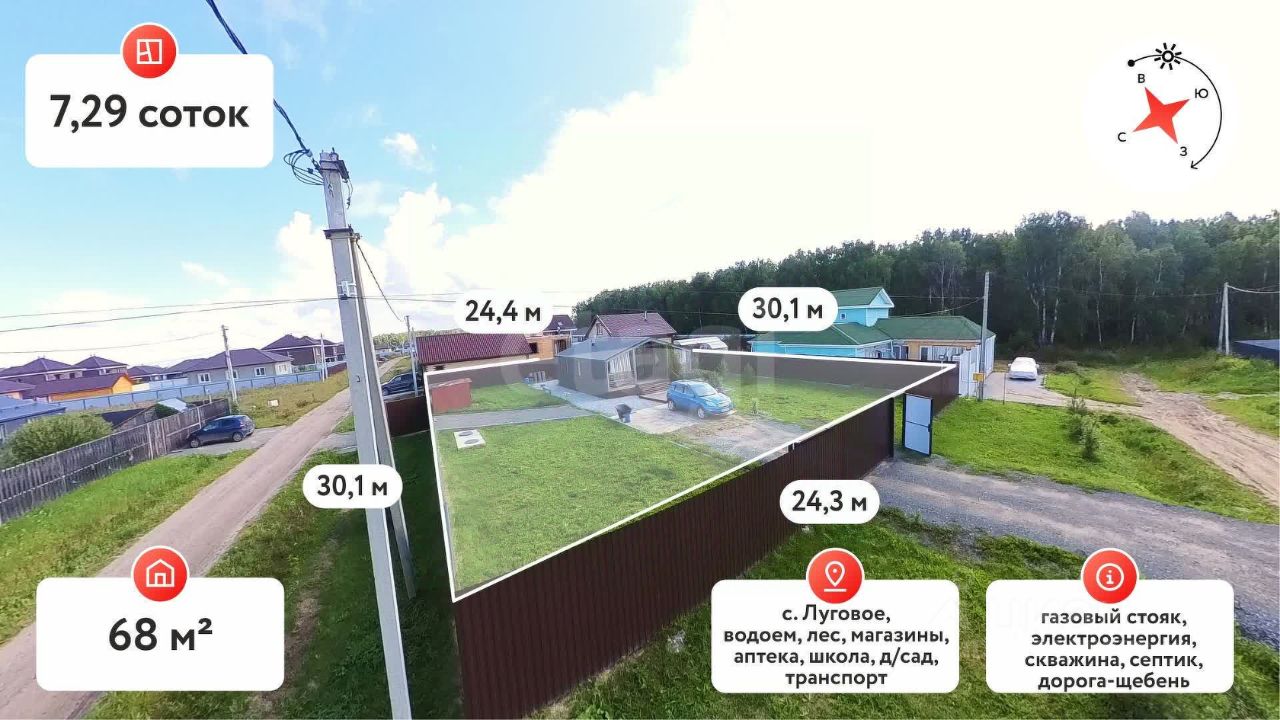 Продается дом с земельным участком 7 соток (ровный, высокий, огорожен со всех сторон) в селе Луговое по скандинавскому проекту. В доме расположена просторная кухня-гостиная, одна спальня, терраса, которую можно использовать как кабинет или сделать комнату, санузел с ванной. Установлены открытые витражные окна, что придаёт комнате больше пространства, функциональности, света и тепла. При строительстве использованы натуральные и экологичные материалы. Снаружи дом отделан деревом и профлистом цвета серый графит. Внутренняя отделка также массив дерева. Утепление 200 мм в полу и 150 мм в стенах и крыше. Дом для комфортной загородной жизни и отдыха в благоустроенном коттеджном поселке. До центра города 15 км, примерно 20 минут на автомобиле. Несколько минут до объездной дороги. Вода-скважина, канализация-септик 10 куб. переливной, фундамент (винтовые сваи), есть кондиционер. Отопление электрическое, газ подведен к участку. На участке есть фруктовые и хвойные деревья, кустарники. При продаже дома остаётся, всё, что есть на фото. При температуре -35 в доме +25. Развитая инфраструктура, в селе есть школа, детский сад, продуктовые, строительные магазины, аптеки, почта и пр. Звоните, помощь в одобрении ипотеки.