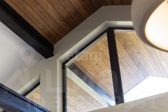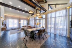 Главная гордость дома— это величественная кухня-гостиная с пятиметровыми потолками и панорамными окнами, наполняющими пространство светом и стирающими границу между интерьером и природой. Большая терраса становится логичным продолжением гостиной в теплые дни.