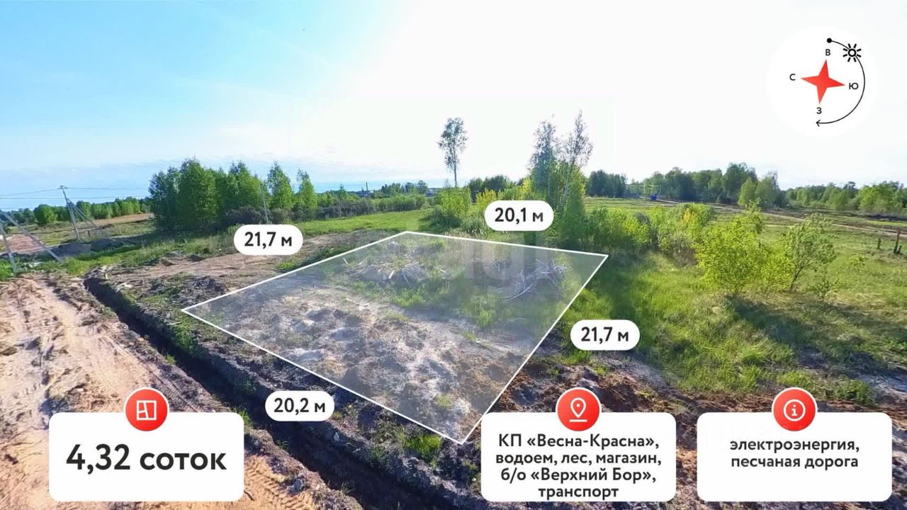 Продается великолепный земельный участок площадью 4,32 сотки в живописном месте в активно развивающимся коттеджном поселке Весна-Красна! Этот участок — идеальное решение для тех, кто мечтает о собственном доме вдали от городской суеты, но при этом в шаговой доступности от всех благ цивилизации. Возможна покупка со смежным участком 4,32 сотки для увеличения площади.