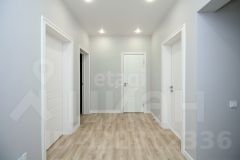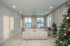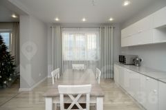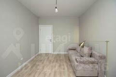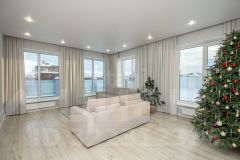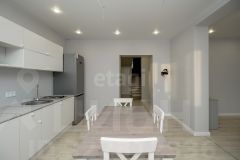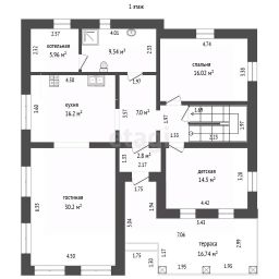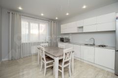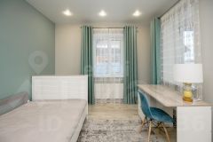 В доме 6 комнат, кухня, 2 санузла, котельная. Комнаты все изолированы, а кухня проходная. Под каждым окном размещен радиатор отопления. Стены во всем доме выровнены и окрашены. При отделке дома использовали нейтральные цвета. Шторы гармонично сочетаются с интерьером. Потолок ПВХ белый матовый. Установлены точечные светильники, также сделаны выводы для люстры. На первом этаже напольное покрытие ламинат, а на втором линолеум. Предусмотрены выводы коммуникаций под кухонный остров. Пол, а также перекрытия между первым и вторым этажом выполнены из плит ЖБИ.