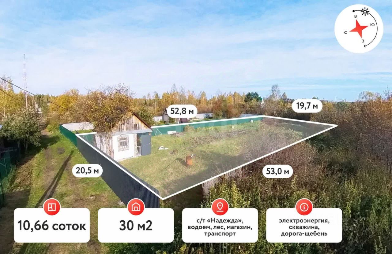 Продается дача в СНТ Надежда, в 25 мин езды от города Тюмени по Ялуторовскому тракту. На участке площадью 10,66 сот расположился летний дом из камня площадью 30 м². Все чисто, аккуратно. В доме 1 комната и веранда. Участок обработан, имеются насаждения. Водоснабжение на участке - колодец с чистейшей питьевой водой. Электричество