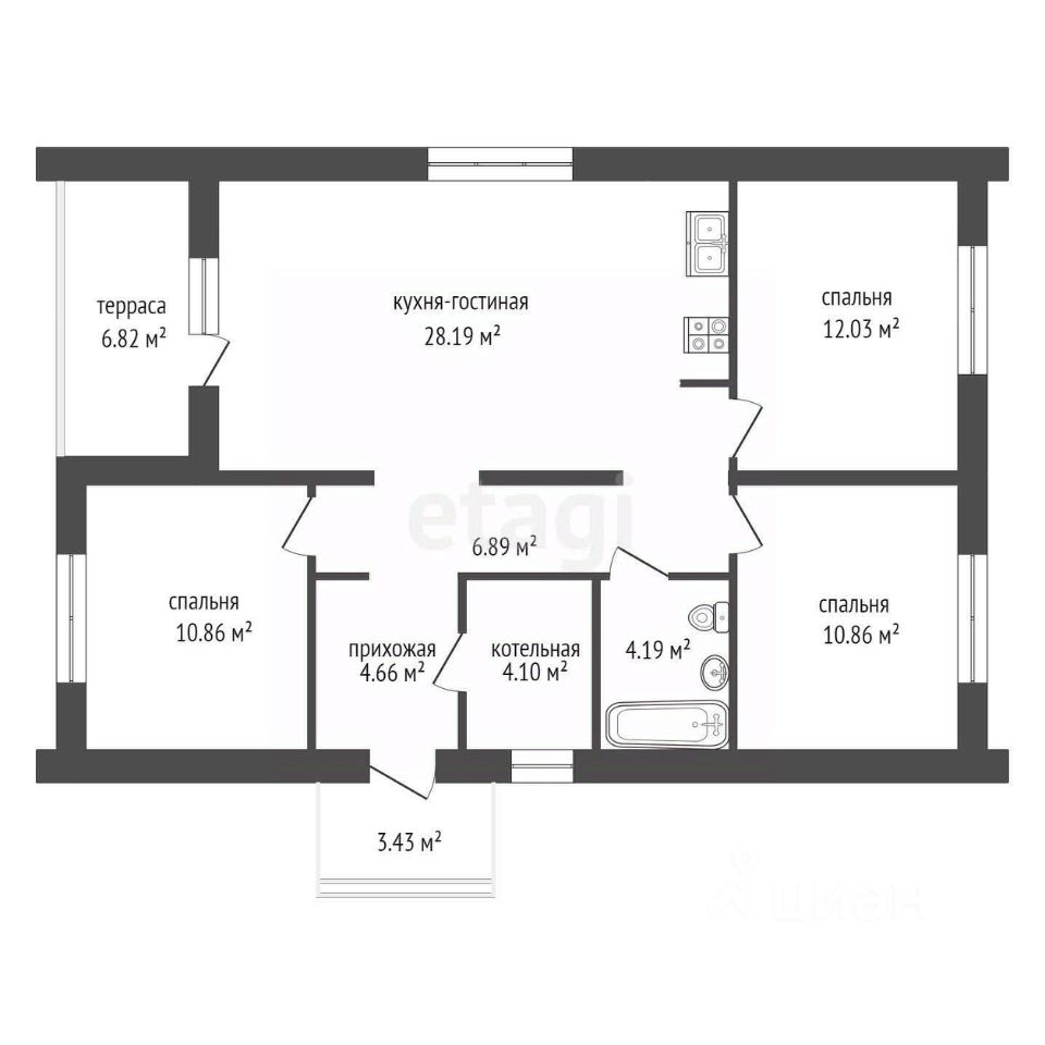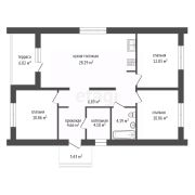 Дом формата 3 +, в нем расположены просторная кухня - гостиная со вторым светом 28м2 высота кровли в коньке 5 метров, три спальных комнаты площадью 12м2,12м2 и 14м2, большой санузел 4,6 м2 и отдельная котельная с выводами под воду. Высота потолков 3 метра.