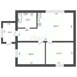2. Планировка: Дом в два этажа. На первом этаже: 2 комнаты, гостиная с зоной кухни, совмещенный санузел. Второй этаж свободное пространство, можно разделить на 2 комнаты и холл.