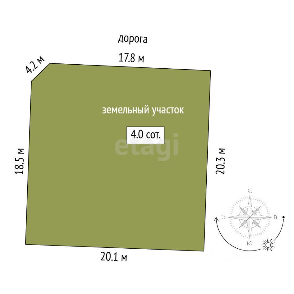 Земельный участок площадью 4 сотки, квадратной формы, размерами 20 м. (ширина), 20 м. длина. Участок угловой, что даёт большое преимущество организовать два заезда.