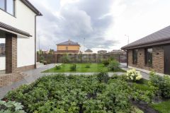 Территория двора облагорожена брусчаткой, произведено ландшафтное озеленение в входной группе.