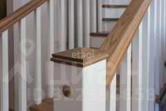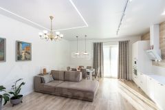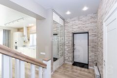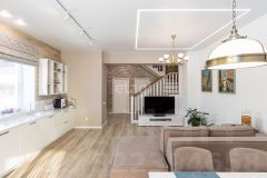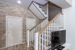 - первый этаж: кухня-гостиная (встроенный кухонный гарнитур, техника, стол и стулья, диван), коридорная зона пространства, рабочий кабинет, совмещенный санузел, хозяйственное пространство. Также есть выход на террасу. В благоустройстве интерьера на первом этаже использован кварц-виниловый пол, лестница из дуба, для отделки стены использован немецкий клинкерный кирпич.