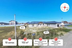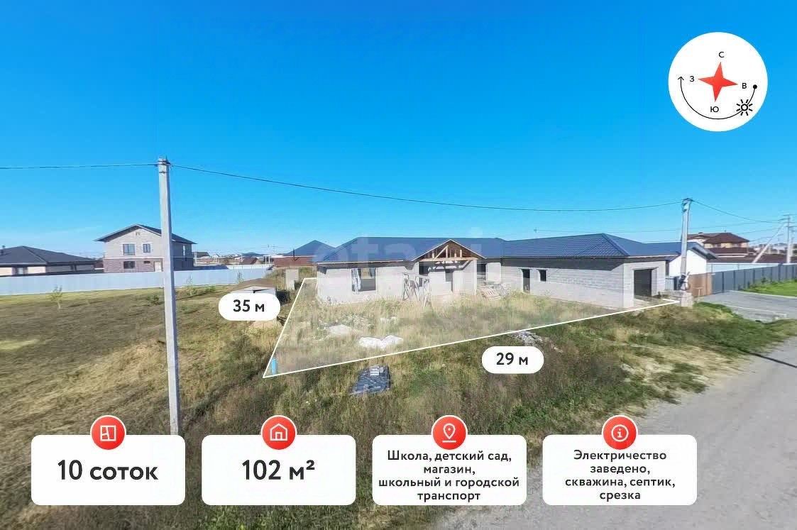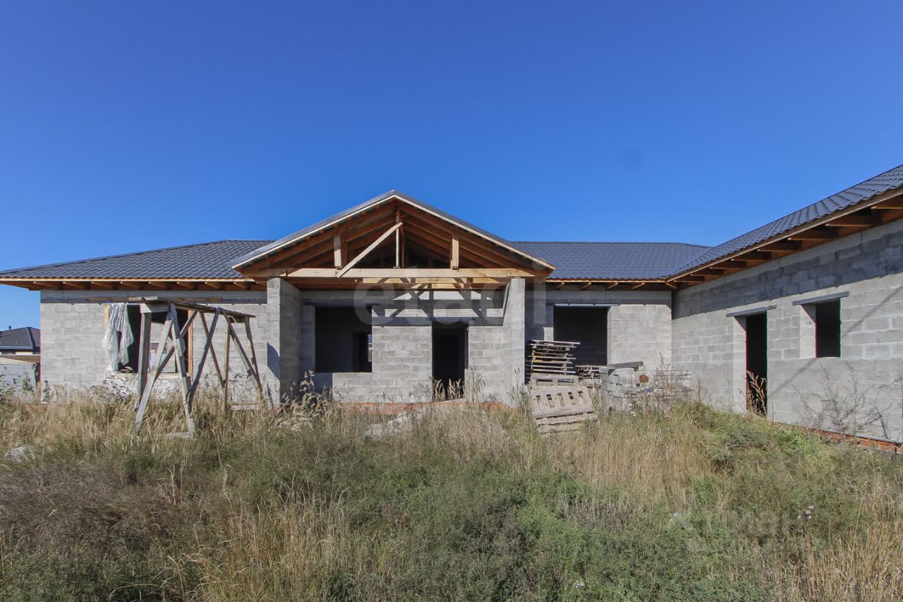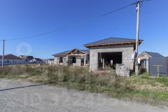 Высокий, ухоженный участок правильной формы, площадью 10 соток. Преимущество - есть скважина на 80 метров. Септик. Заведено электричество, есть свет. На участке постороен большой дом с гаражом на 2 машино-места и котельной, в черновой отделке. Дом площадью 102 кв.м., гараж с котельной 75 кв.м.