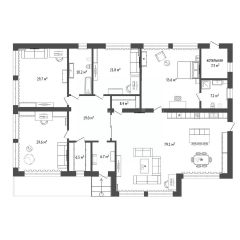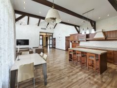 * Основной жилой дом - одноэтажный со вторым светом (высота потолков 3.2, в коньке 5.2), с огромными витражными окнами.